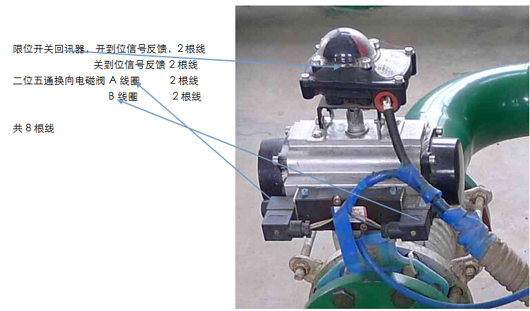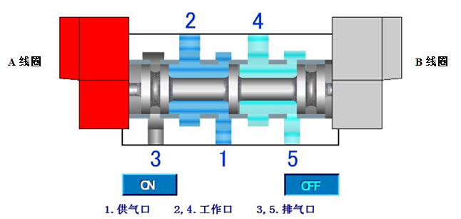 当电磁阀B线圈得电时,4 孔进气,2 孔排气,气动阀门执行器顺时针转动,阀门关闭